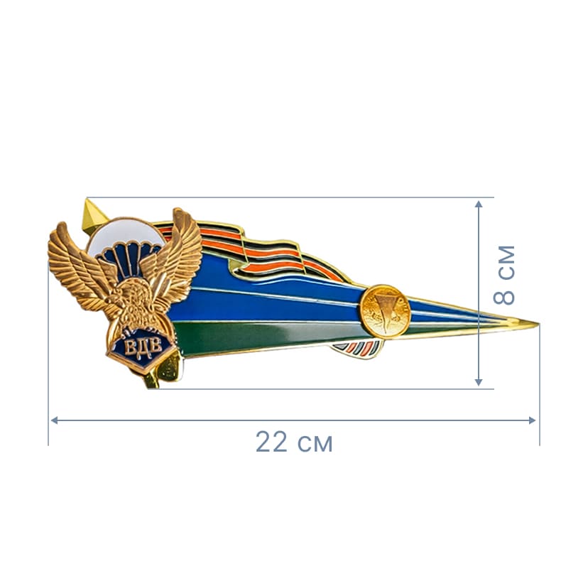 Компактный металлический знак в форме треугольного вымпела, выполненный в цветах государственного флага Российской Федерации. Изделие украшено рельефным изображением двуглавого орла с короной, геральдическим щитом и воинскими атрибутами. Поверхность изделия разделена на три горизонтальные полосы: белую, синюю и красную, покрытые холодной эмалью. Контур знака и декоративные элементы выполнены из металла золотистого цвета.